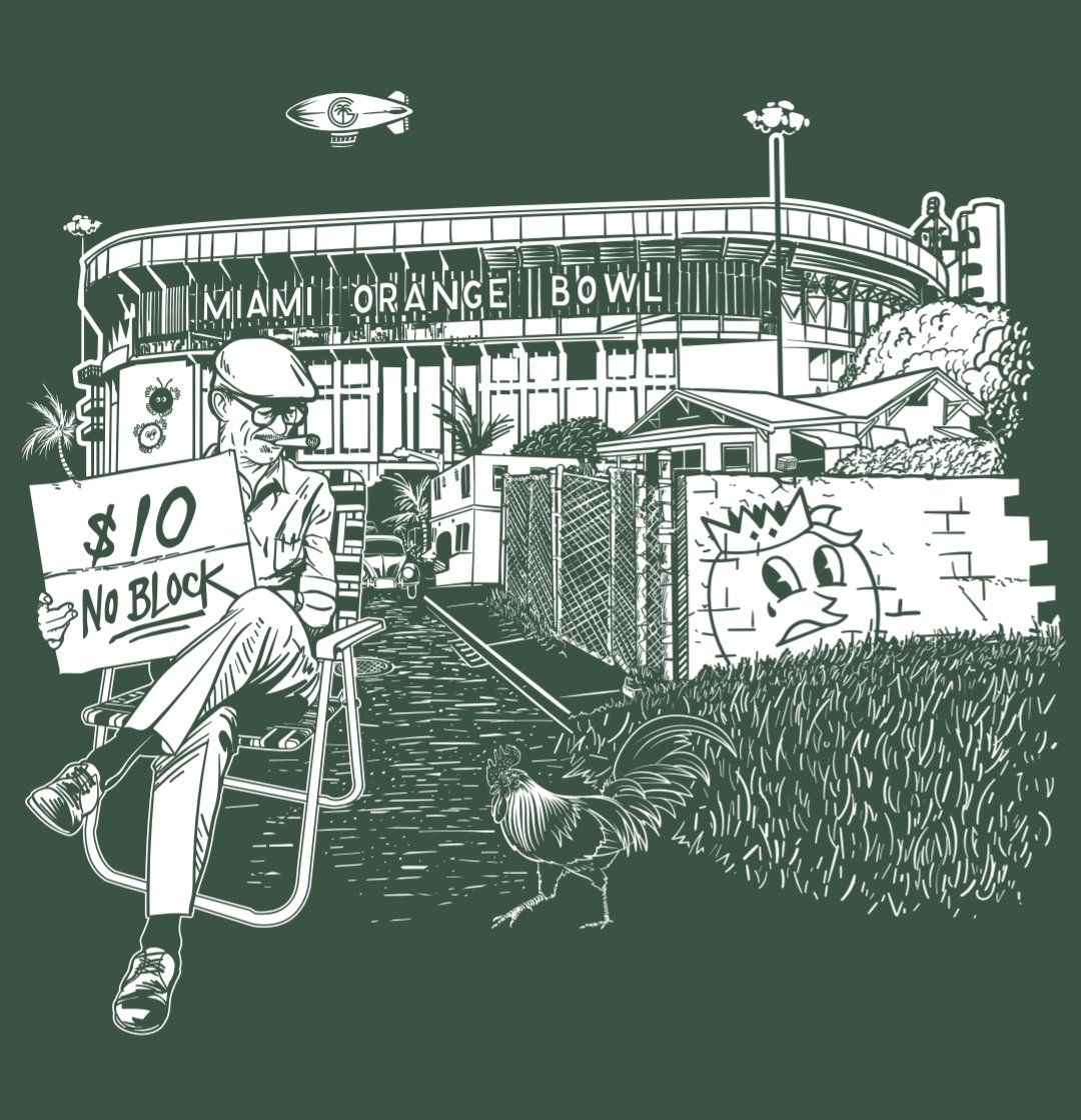 Original design capturing the game day experience at historic Miami Orange Bowl and its surrounding neighborhood back in the day